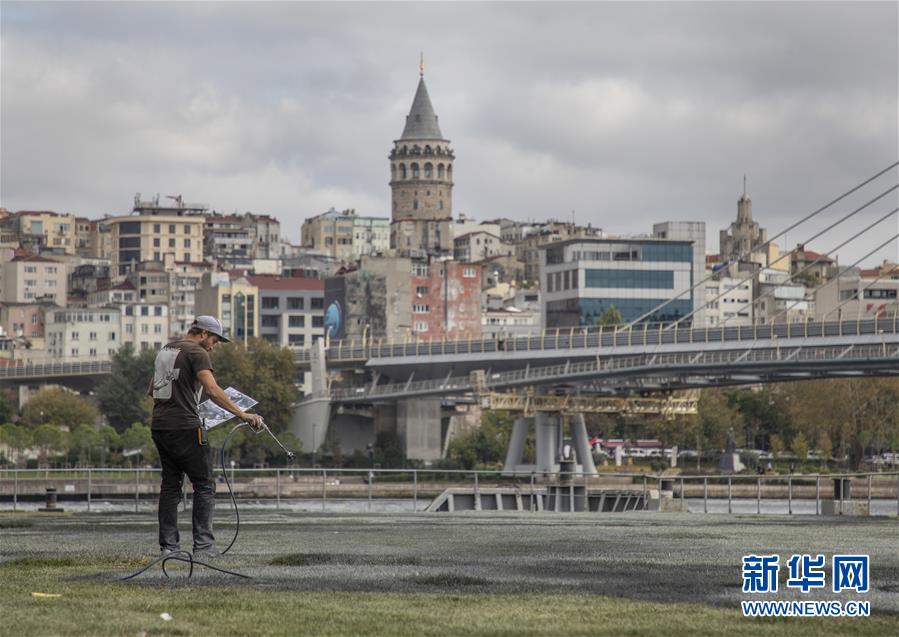 10月22日,在土耳其伊斯坦布尔,法国艺术家纪尧姆·勒格罗在绘制巨幅露天绘画作品。 新华社发(奥斯曼·厄尔萨尔 摄)