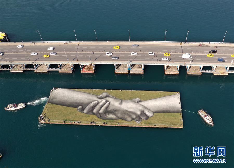 这是10月24日在土耳其伊斯坦布尔航拍的法国艺术家纪尧姆·勒格罗绘制的巨幅露天绘画作品。(无人机拍摄) 新华社发(奥斯曼·厄尔萨尔 摄)