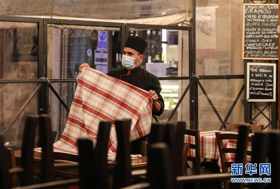 10月26日,意大利首都罗马鲜花广场上一家餐馆临近18时准备打烊。 意大利政府采取一系列新措施,进一步加强新冠疫情防控。自10月26日零时起至11月24日,意大利禁止酒吧、咖啡馆、餐厅、冰淇淋店等每天18时后继续提供堂食。 新华社记者 程婷婷 摄