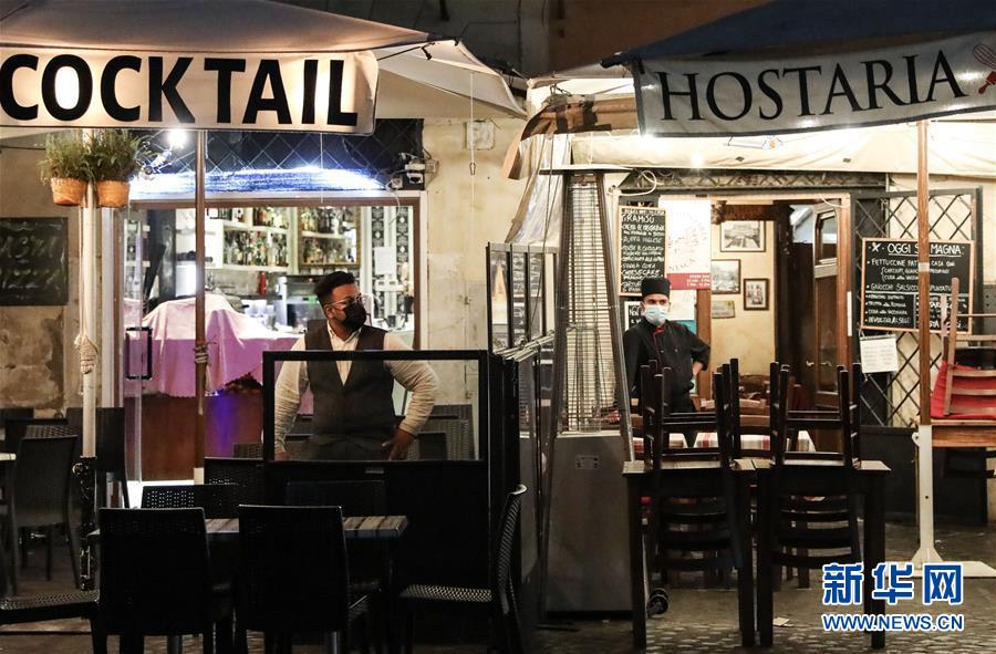 10月26日,意大利首都罗马鲜花广场上两家餐馆临近18时准备打烊。 意大利政府采取一系列新措施,进一步加强新冠疫情防控。自10月26日零时起至11月24日,意大利禁止酒吧、咖啡馆、餐厅、冰淇淋店等每天18时后继续提供堂食。 新华社记者 程婷婷 摄