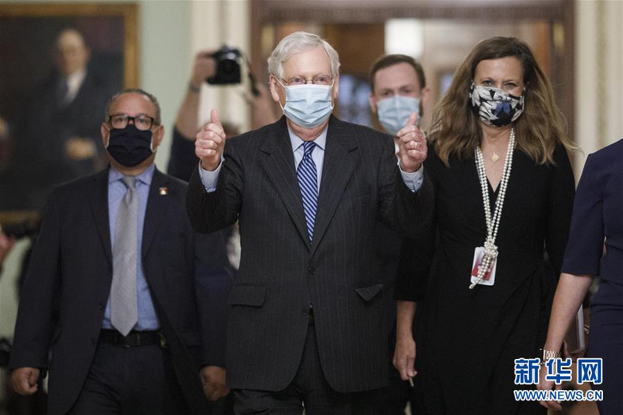 10月26日,在美国华盛顿,美国国会参议院多数党领袖麦康奈尔(中)走出参议院时做手势。 美国国会参议院26日晚投票通过总统特朗普提名的埃米·科尼·巴雷特出任联邦最高法院大法官,特朗普随后在白宫为巴雷特举行宣誓就职仪式。 新华社发(沈霆 摄)