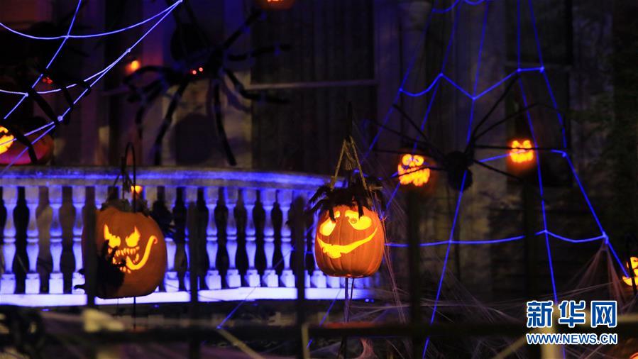 这是10月26日在美国新奥尔良市拍摄的“鬼怪庄园”南瓜灯装饰。 在美国新奥尔良市,一栋民居被装饰成“鬼怪庄园”以迎接万圣节,吸引行人驻足观看。 新华社发(魏兰摄)