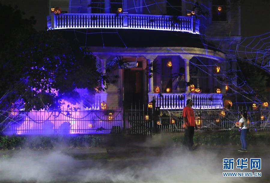 10月26日,在美国新奥尔良市,人们驻足观看“鬼怪庄园”。 在美国新奥尔良市,一栋民居被装饰成“鬼怪庄园”以迎接万圣节,吸引行人驻足观看。 新华社发(魏兰摄)