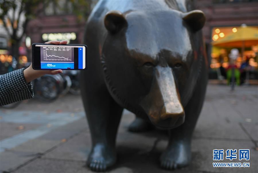 这是10月28日在德国法兰克福证券交易所外的“熊牛对峙”雕塑旁拍摄的手机屏幕上显示的实时法兰克福股市DAX指数。 德国法兰克福股市DAX指数28日下跌503.06点,跌幅为4.17%,报收于11560.51点。 新华社记者逯阳摄