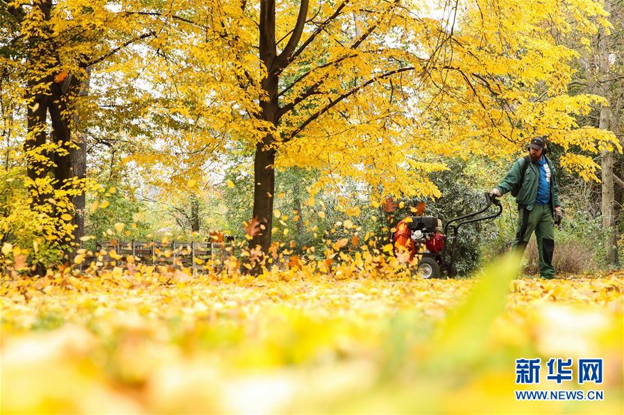10月28日,在德国首都柏林的一座公园,一名工作人员清理道路上的落叶。 新华社记者 单宇琦 摄
