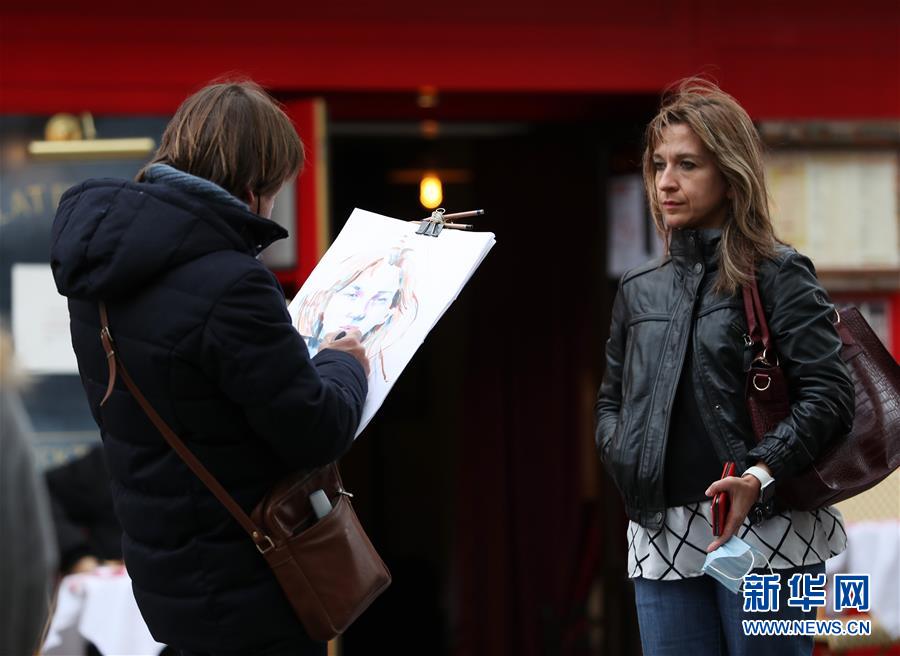 10月28日,在法国巴黎蒙马特高地小丘广场,一名街头画家为顾客作画。 法国总统马克龙28日在电视讲话中宣布,为遏制新冠疫情蔓延,法国将从30日起再度全国“封城”。餐馆、酒吧等非生活必需的营业场所将关闭,民众的非必要出行将被禁止,大学将关闭并进行网络授课,政府鼓励企业远程办公。 新华社记者 高静 摄