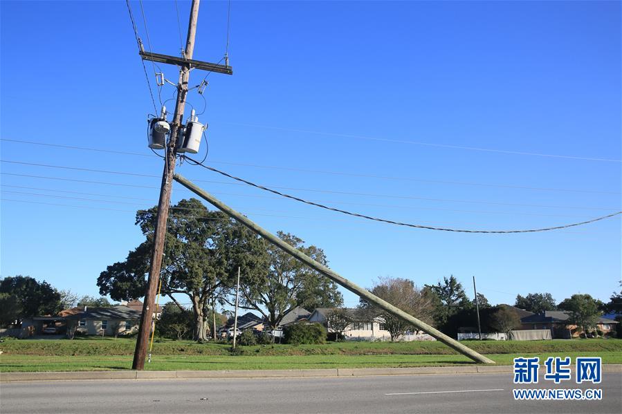 这是10月29日在美国路易斯安那州新奥尔良拍摄的飓风“泽塔”刮歪的电线杆。 据美国媒体29日报道,飓风“泽塔”28日在美国南部登陆,造成至少6人死亡,路易斯安那州等地大面积停电。 新华社发(魏兰摄)