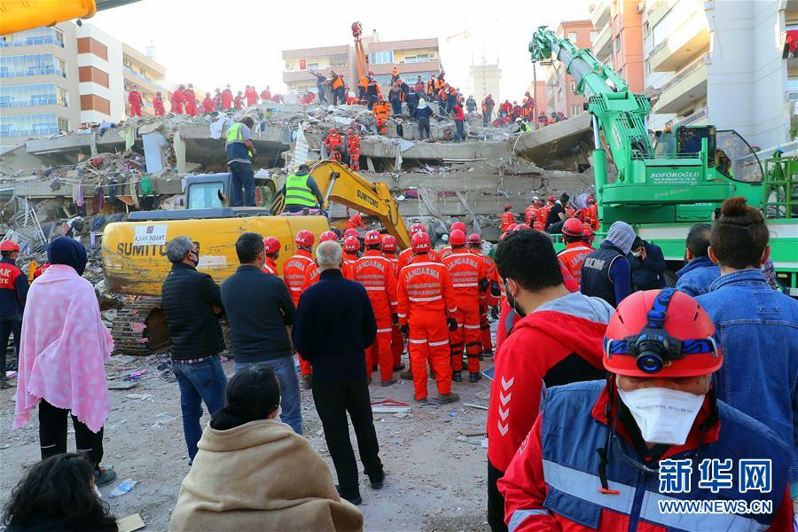 10月31日,在土耳其伊兹密尔省,救援人员在地震中受损的建筑展开搜救工作。 跨土耳其西部海岸的爱琴海海域10月30日发生6.6级地震。截至31日上午,地震已致土耳其25人死亡。 新华社发(艾登·切廷卡亚摄)