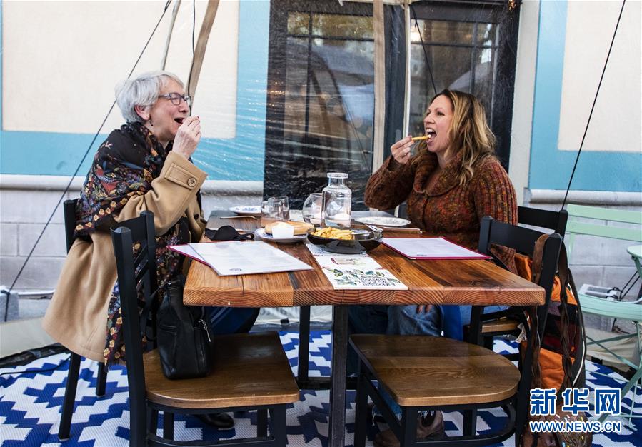 10月30日,在美国伊利诺伊州芝加哥,顾客在餐馆室外帐篷中用餐。 当日,伊利诺伊州新增新冠确诊病例6943例。从当日起,伊利诺伊州再次禁止芝加哥的餐馆、酒吧等提供室内餐饮服务,室外餐饮必须在晚11时停止。 新华社发(乔尔·莱纳摄)