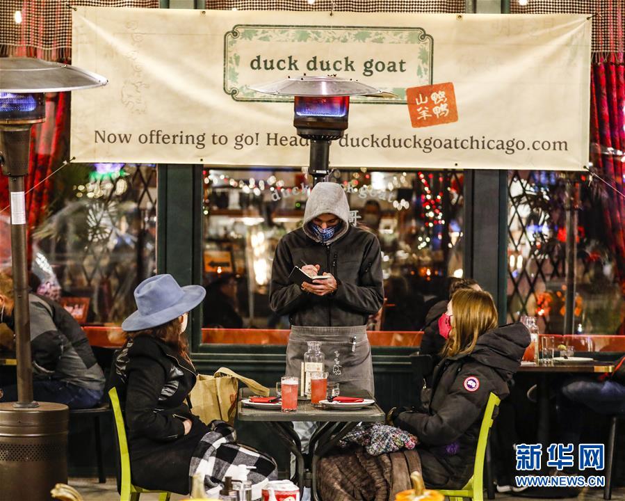 10月30日,在美国伊利诺伊州芝加哥,一名服务员在餐馆室外就餐区为顾客点餐。 当日,伊利诺伊州新增新冠确诊病例6943例。从当日起,伊利诺伊州再次禁止芝加哥的餐馆、酒吧等提供室内餐饮服务,室外餐饮必须在晚11时停止。 新华社发(乔尔·莱纳摄)