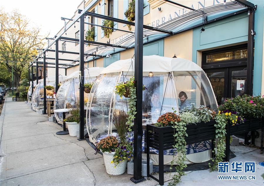 10月30日,在美国伊利诺伊州芝加哥,顾客在餐馆室外帐篷中用餐。 当日,伊利诺伊州新增新冠确诊病例6943例。从当日起,伊利诺伊州再次禁止芝加哥的餐馆、酒吧等提供室内餐饮服务,室外餐饮必须在晚11时停止。 新华社发(乔尔·莱纳摄)