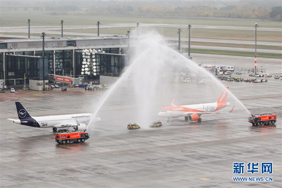 10月31日,在德国首都柏林南郊,柏林-勃兰登堡机场为抵达的一架易捷航空公司航班(右)和一架汉莎航空公司航班举行欢迎仪式。 柏林的新机场柏林-勃兰登堡机场于10月31日正式启用。柏林-勃兰登堡机场又名维利·勃兰特机场,位于柏林南郊,启用后将代替柏林泰格尔机场和舍内费尔德机场,成为柏林唯一民用空港及客运吞吐量仅次于法兰克福机场和慕尼黑机场的德国第三大机场。 新华社发(托马斯·克勒摄)