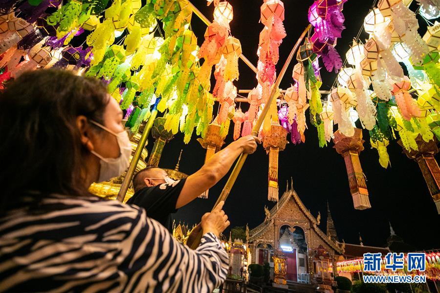 11月1日,人们在泰国南奔府哈利奔猜寺的灯会上将写有美好祝愿的灯笼挂起。 近日,泰国南奔府在哈利奔猜寺举办盛大灯会,十万盏灯笼将哈利奔猜寺点缀成了七彩缤纷的灯笼“海洋”。人们来到这里,将美好的祝愿写在灯笼上,并高高挂起,为新的一年祈福。 新华社记者 张可任 摄