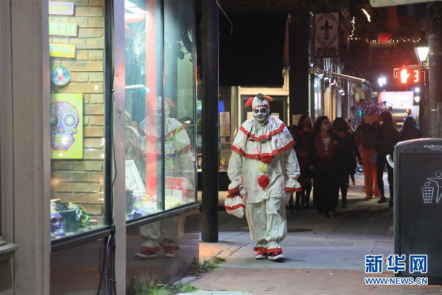 10月31日,在美国路易斯安那州新奥尔良,一名打扮成小丑的男子在街头庆祝万圣夜。 当日,美国多地民众庆祝万圣夜。受新冠疫情影响,多地的公众集会受到限制。 新华社发(魏兰摄)