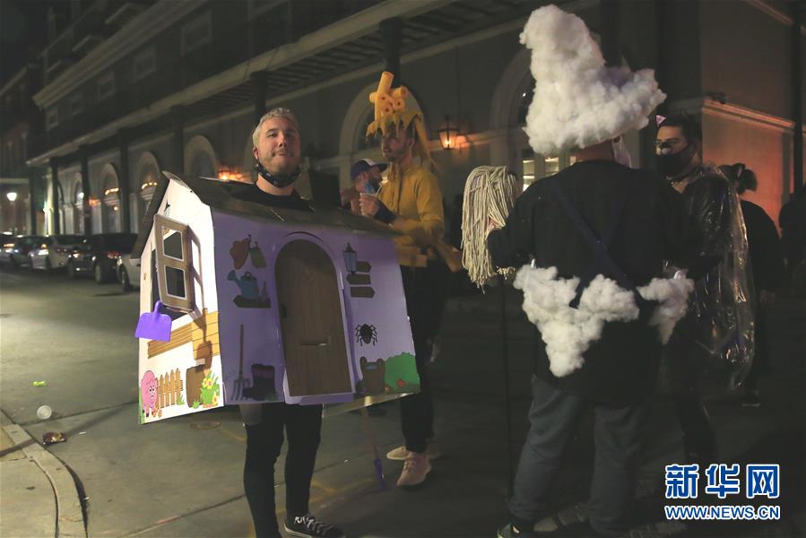 10月31日,在美国路易斯安那州新奥尔良,人们在街头庆祝万圣夜。 当日,美国多地民众庆祝万圣夜。受新冠疫情影响,多地的公众集会受到限制。 新华社发(魏兰摄)