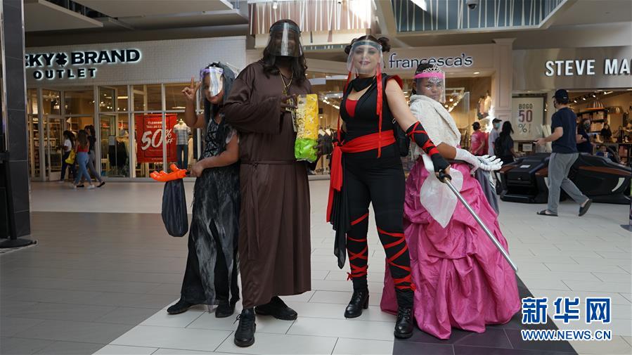 10月31日,在美国加利福尼亚州圣贝纳迪诺县一家购物中心,人们参加万圣夜庆祝活动。 当日,美国多地民众庆祝万圣夜。受新冠疫情影响,多地的公众集会受到限制。 新华社发(曾慧摄)