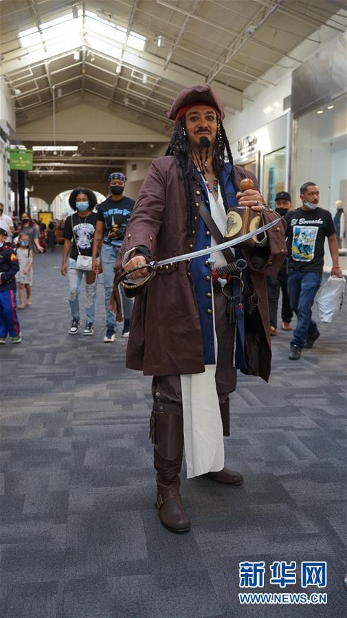 10月31日,在美国加利福尼亚州圣贝纳迪诺县一家购物中心,一名打扮成海盗的男子参加万圣夜庆祝活动。 当日,美国多地民众庆祝万圣夜。受新冠疫情影响,多地的公众集会受到限制。 新华社发(曾慧摄)