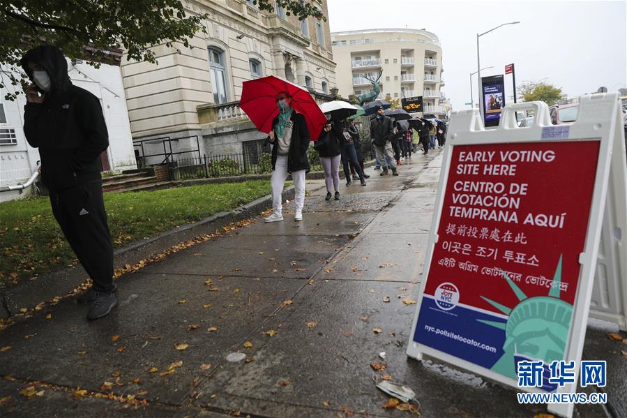 11月1日,在美国纽约一个投票站外,选民冒雨排队参加提前投票。 当日,为期9天的纽约州2020美国大选提前投票结束。 新华社记者 王迎 摄