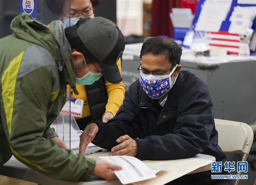11月1日,在美国纽约一个投票站,工作人员为选民解答问题。 当日,为期9天的纽约州2020美国大选提前投票结束。 新华社记者 王迎 摄