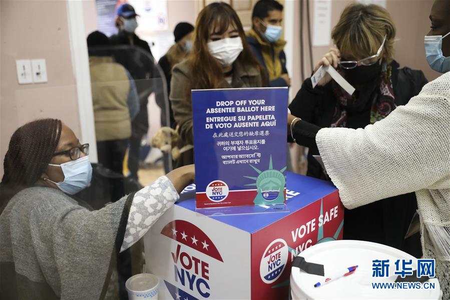 11月1日,选民在美国纽约一个投票站参加提前投票。 当日,为期9天的纽约州2020美国大选提前投票结束。 新华社记者 王迎 摄