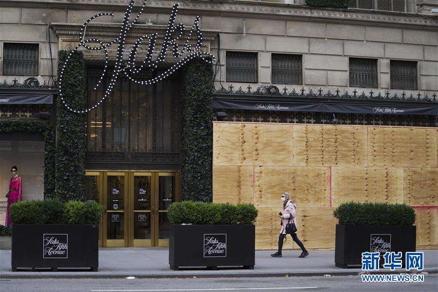 11月1日,在美国纽约第五大道,行人从一家安装了防护板的商场旁走过。 由于担心发生骚乱带来损失,纽约不少商店和写字楼开始加强防护和安保。 新华社记者王迎摄