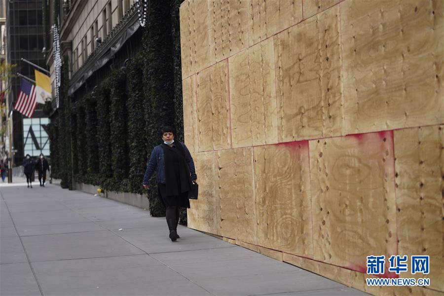 11月1日,在美国纽约第五大道,行人从一家安装了防护板的商店旁走过。 由于担心发生骚乱带来损失,纽约不少商店和写字楼开始加强防护和安保。 新华社记者王迎摄