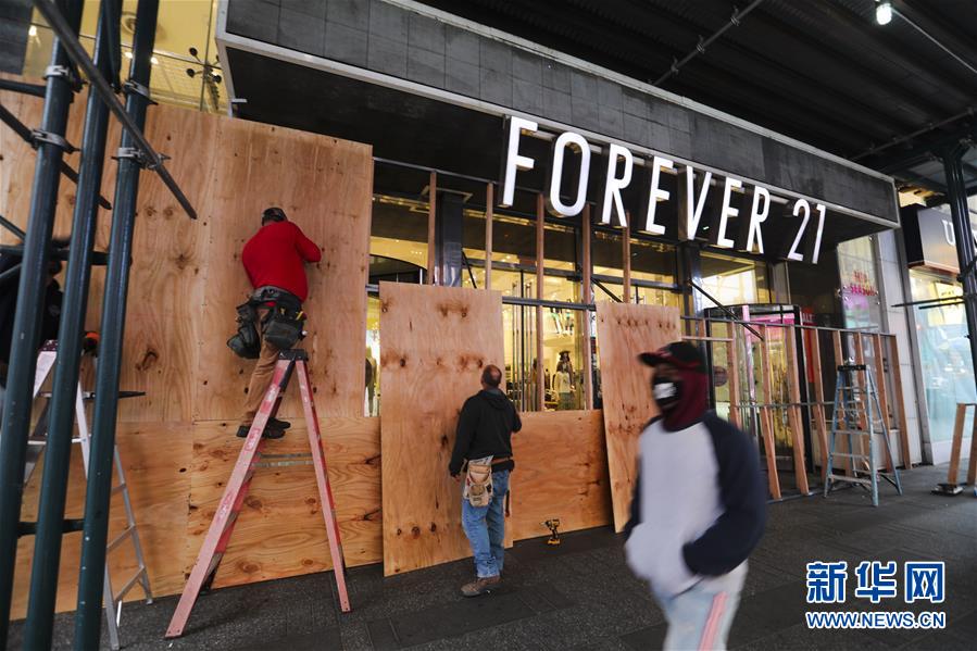 11月1日,在美国纽约时报广场,工人为一家商店安装防护板。 由于担心发生骚乱带来损失,纽约不少商店和写字楼开始加强防护和安保。 新华社记者王迎摄