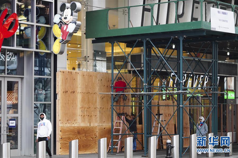 11月1日,在美国纽约时报广场,工人为一家商店安装防护板。 由于担心发生骚乱带来损失,纽约不少商店和写字楼开始加强防护和安保。 新华社记者王迎摄