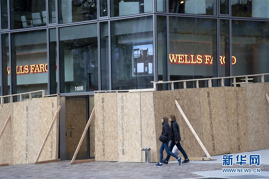 11月1日,美国华盛顿白宫附近一家银行用木板加固了门窗。 新华社记者 刘杰 摄