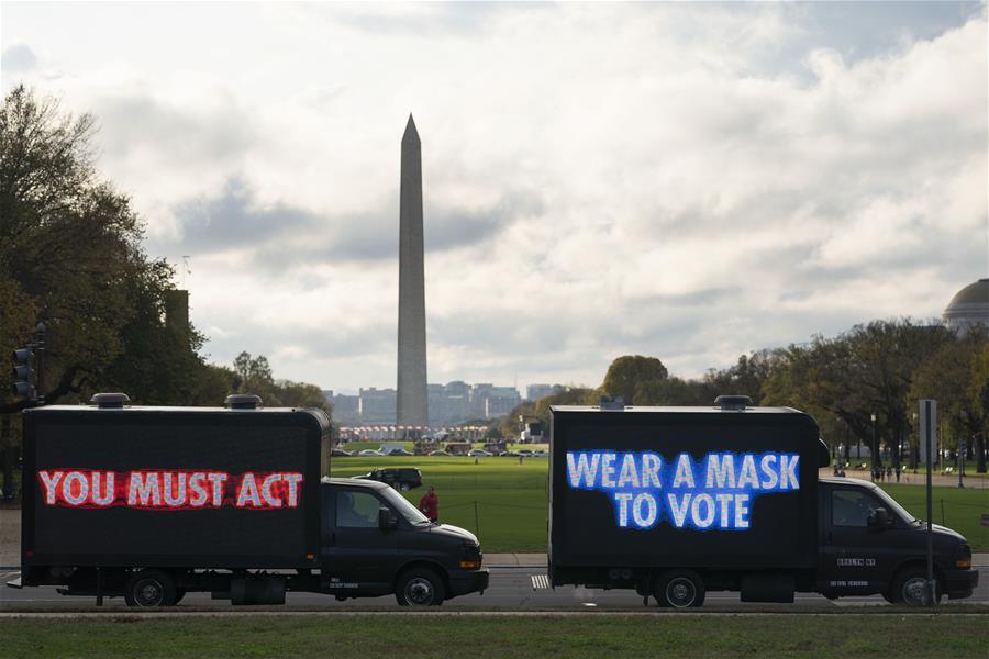 这是11月1日在美国华盛顿拍摄的华盛顿纪念碑和路边的竞选标语。 新华社记者 刘杰 摄