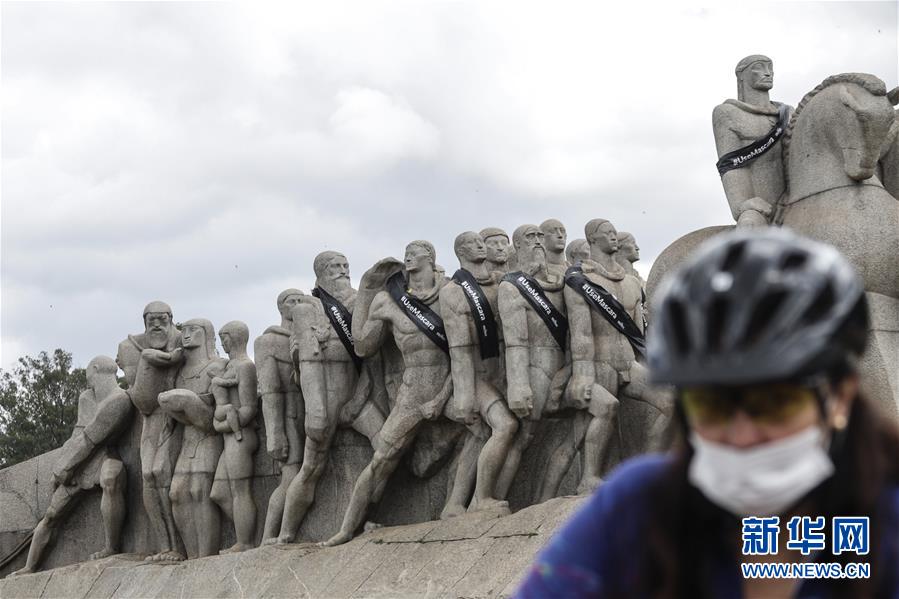 这是11月2日在巴西圣保罗市街头拍摄的佩戴写有“使用口罩”字样条幅的雕塑。当日,圣保罗州政府举行仪式悼念该州的新冠病亡者,其中包括给圣保罗市多处的雕塑披上写有“使用口罩”字样的条幅,告诫民众不要放松警惕。 巴西卫生部2日公布的最新数据显示,过去24小时巴西新增新冠确诊病例8501例,累计确诊5554206例。 新华社发(拉赫尔·帕特拉索摄)