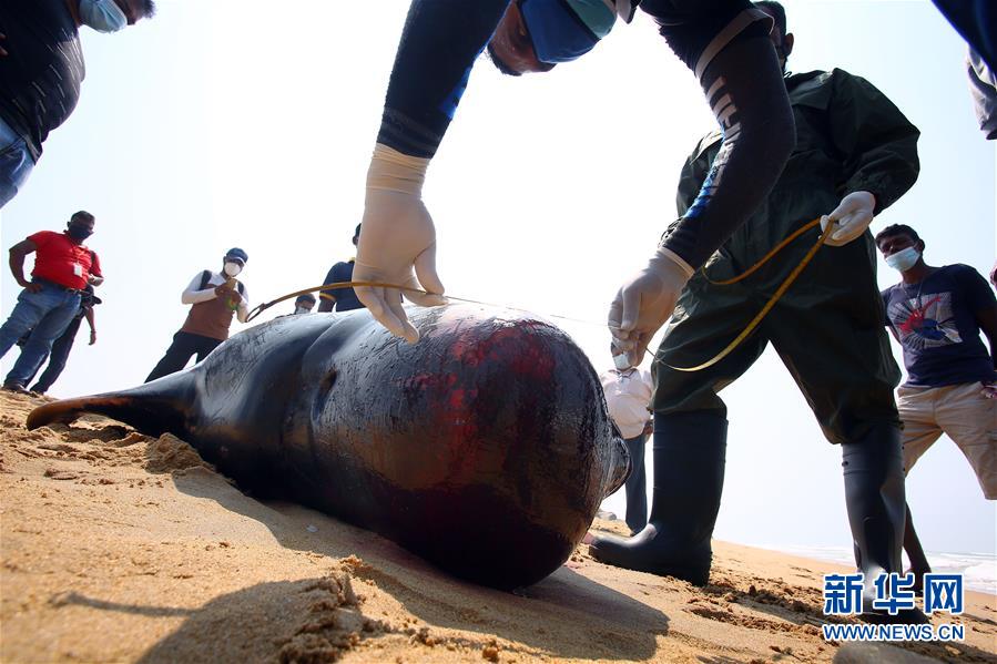 11月3日,在斯里兰卡科伦坡附近的帕讷杜勒,当地人检查一头死亡的鲸鱼。 11月2日,大约120头鲸鱼在科伦坡附近的帕讷杜勒海岸集体搁浅。经过当地近70名海岸警卫队和海军等人员18个小时的彻夜救助,100多头鲸鱼被送回大海,4只鲸鱼不幸死亡。斯里兰卡海洋生物学家表示,这是迄今发生在斯里兰卡的最大规模鲸鱼搁浅事件。 新华社发(阿吉特·佩雷拉 摄)