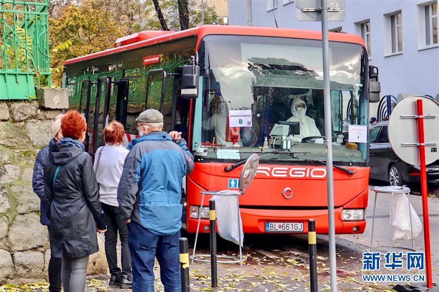 10月31日,民众在斯洛伐克布拉迪斯拉发一个设立在大巴上的检测点门口排队。新华社发