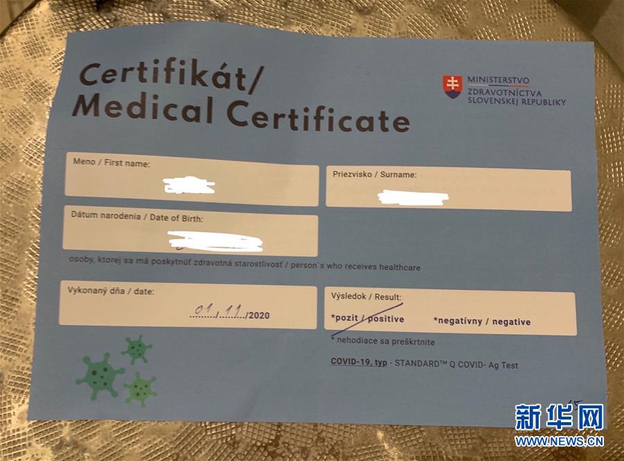 这是11月2日在斯洛伐克布拉迪斯拉发拍摄的记者得到的被称为“斯洛伐克绿码”的阴性医学证明。新华社记者蒋雪摄