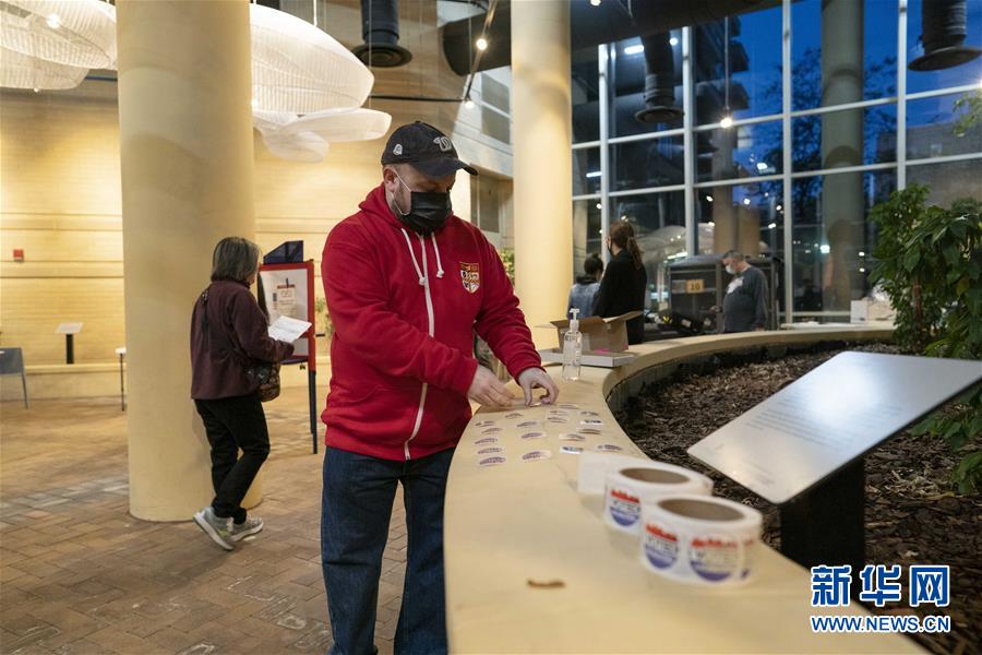 11月3日,选民在美国弗吉尼亚州阿灵顿一处投票站投票后领取大选标贴。 2020年美国大选选举日投票3日开始,全美预计将有数千万名选民前往投票站,投票选出下一任美国总统、数百名国会议员及部分地方官员。 新华社记者 刘杰 摄