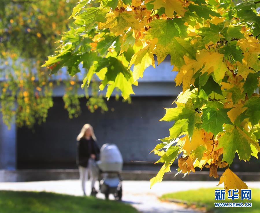 11月3日,一名女子推婴儿车行走在白俄罗斯首都明斯克的一处公园。 新华社发(任科夫摄)