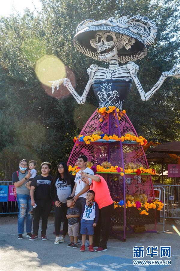 11月2日,在美国得克萨斯州圣安东尼奥,人们在亡灵节装饰前留影。 每年的11月1日和2日是墨西哥的传统节日亡灵节,亡灵节是墨西哥最隆重、最独特的节日之一。在圣安东尼奥,墨西哥后裔聚集在一起庆祝节日,怀念逝者。 新华社发(马烈摄)