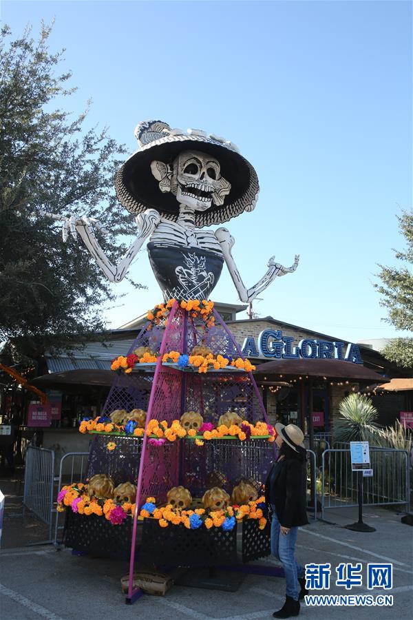 11月2日,在美国得克萨斯州圣安东尼奥,一名行人从亡灵节装饰前走过。 每年的11月1日和2日是墨西哥的传统节日亡灵节,亡灵节是墨西哥最隆重、最独特的节日之一。在圣安东尼奥,墨西哥后裔聚集在一起庆祝节日,怀念逝者。 新华社发(马烈摄)