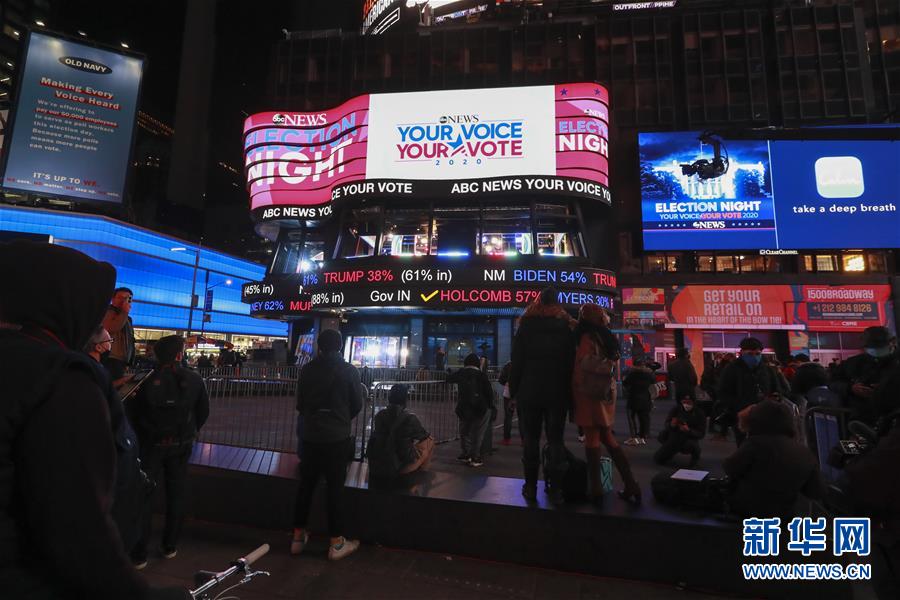 11月3日,人们在美国纽约时报广场观看实时计票结果。 2020年美国大选投票当地时间3日晚全部结束,并随即开始计票。经过一夜等待,美国人未能等来谁将成为他们下一任总统的明确结果。根据初步计票和美国各大媒体测算,共和党总统候选人、现任总统特朗普和民主党总统候选人、前副总统拜登选情异常胶着,截至美国东部时间4日6时,两人均暂未获得当选总统所需的270张选举人票。 新华社记者 王迎 摄