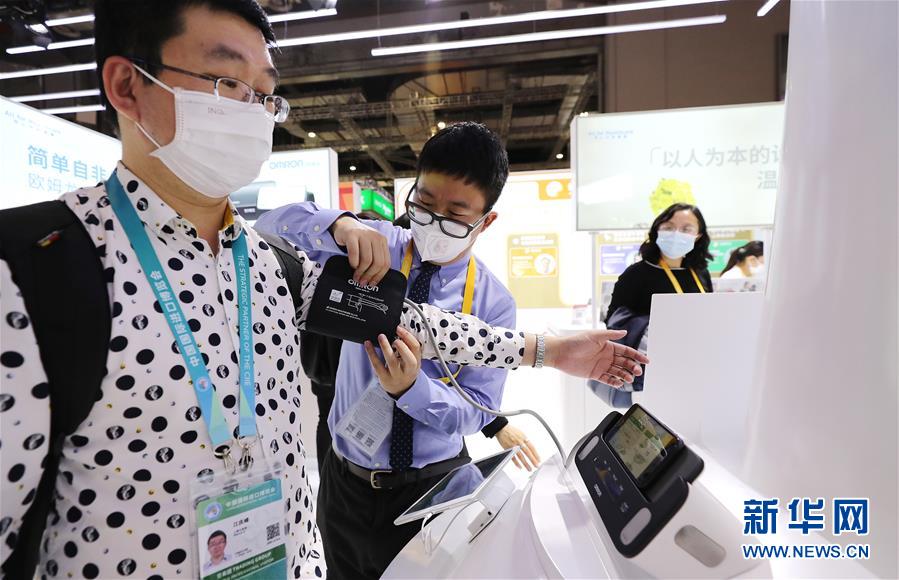 11月5日,工作人员(左二)在协助参观者体验欧姆龙公司一款心电一体血压计。该款血压计通过与智能手机连接实现血压和心电图同步检测。
