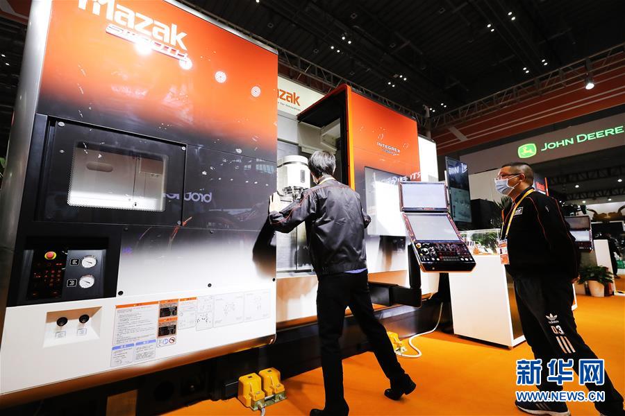 11月5日,工作人员在展台上调试马扎克复合加工机。新华社记者 方喆 摄