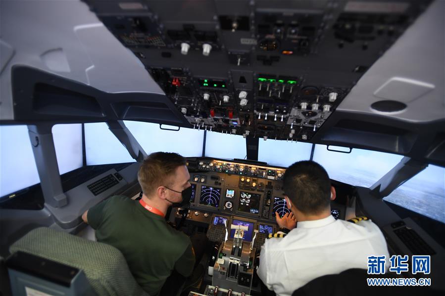 11月5日,在进博会技术装备展区,一名观众在莱特兄弟展台体验飞行模拟器。新华社记者 李任滋 摄