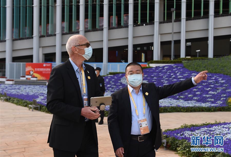11月5日,罗伊(左)和同事进入上海国家会展中心。 新华社记者 赵丁喆 摄
