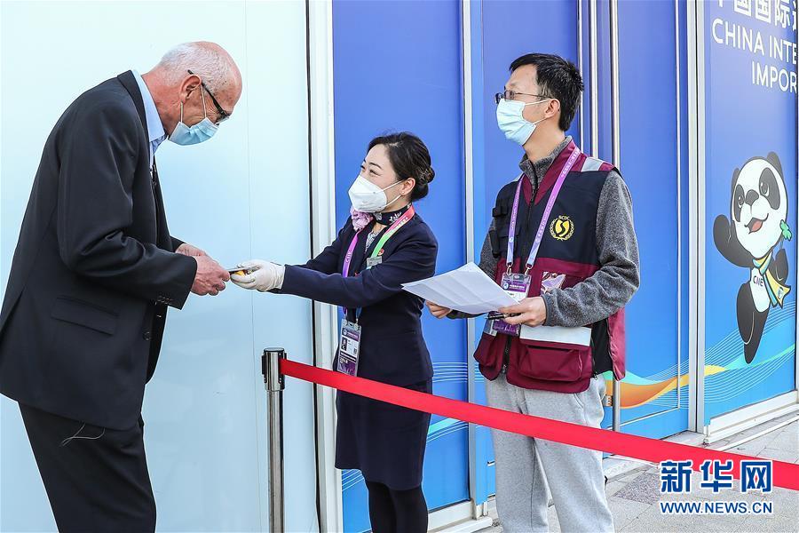 11月5日,罗伊(左)从工作人员手中接过自己的参会证件。 新华社记者 张玉薇 摄