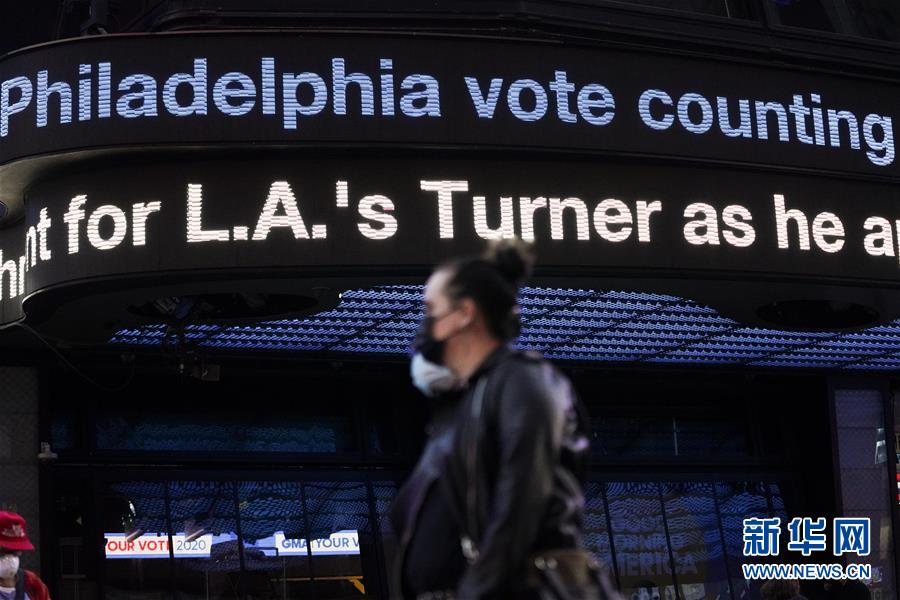 11月6日,在美国纽约时报广场,电子屏播放关于大选的新闻。 美国大选计票工作7日仍在进行,几个关键“摇摆州”因两名总统候选人获得选票数的差距过小,其选举人票的最终归属仍未确定。 新华社记者 王迎 摄