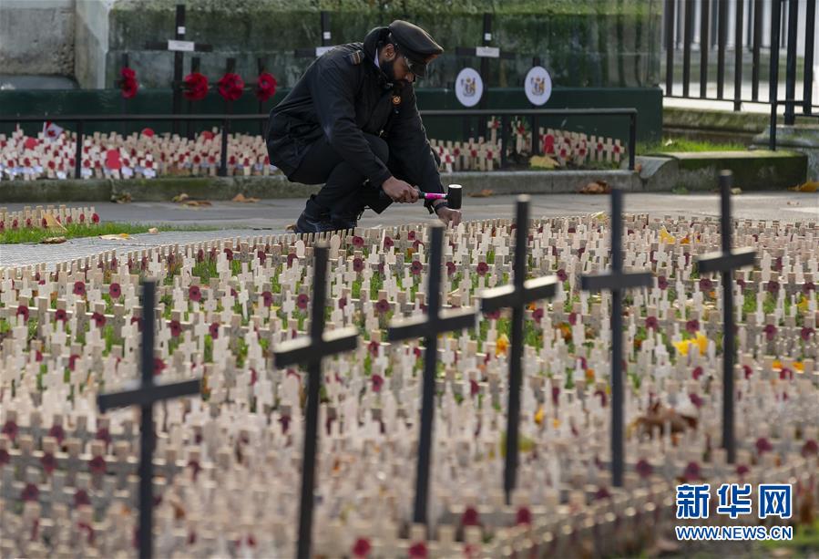 11月7日,一名工作人员在英国伦敦的威斯敏斯特教堂外摆放“罂粟花十字架”。 英国伦敦威斯敏斯特教堂外的草坪摆放了众多“罂粟花十字架”,迎接即将到来的“阵亡将士纪念日”,纪念在第一次世界大战中阵亡的将士。11月11日是英联邦国家停战纪念日,也称“阵亡将士纪念日”。 新华社记者 韩岩 摄