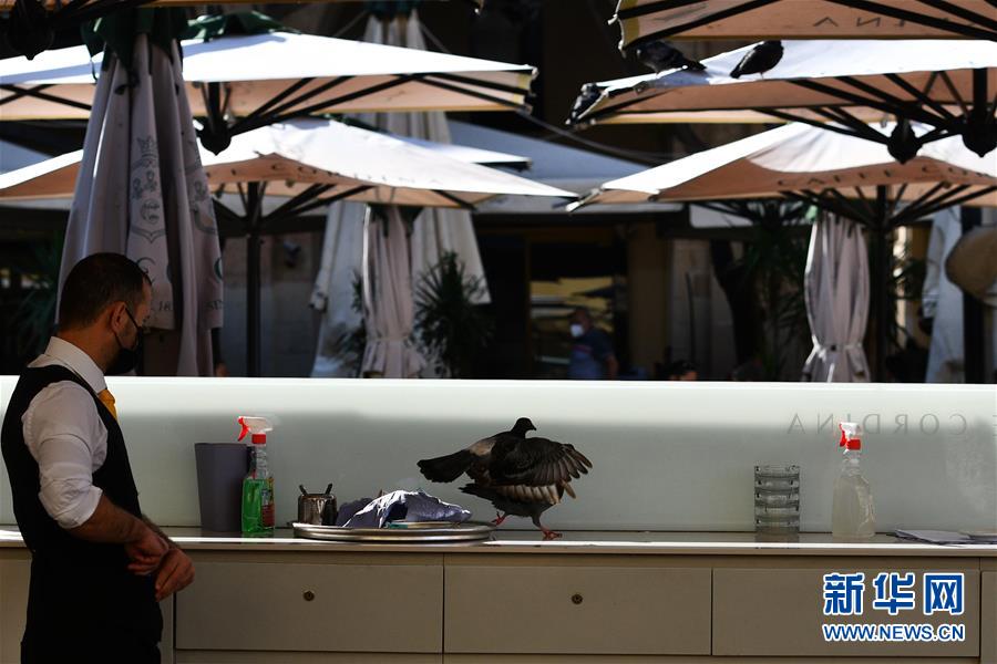 11月7日,一名戴口罩的服务生在马耳他瓦莱塔一家餐厅工作。新华社发(乔纳森·博格摄)