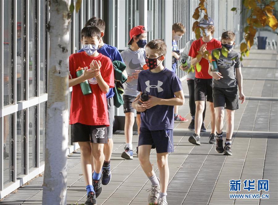 11月8日,在加拿大里士满市,儿童们戴着口罩到户外活动。 截至当日下午,加拿大累计新冠确诊病例上升至264045例,累计死亡病例10522例。 新华社发(梁森摄)