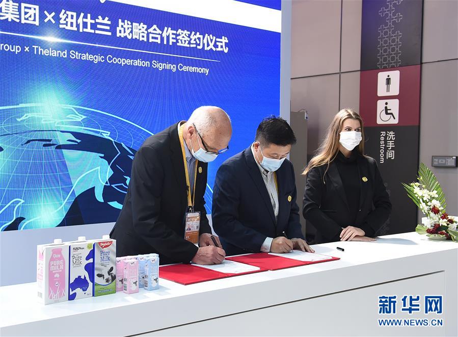 11月5日,罗伊(左一)在进博会上的纽仕兰乳业展台参加签约仪式。新华社记者 赵丁喆 摄