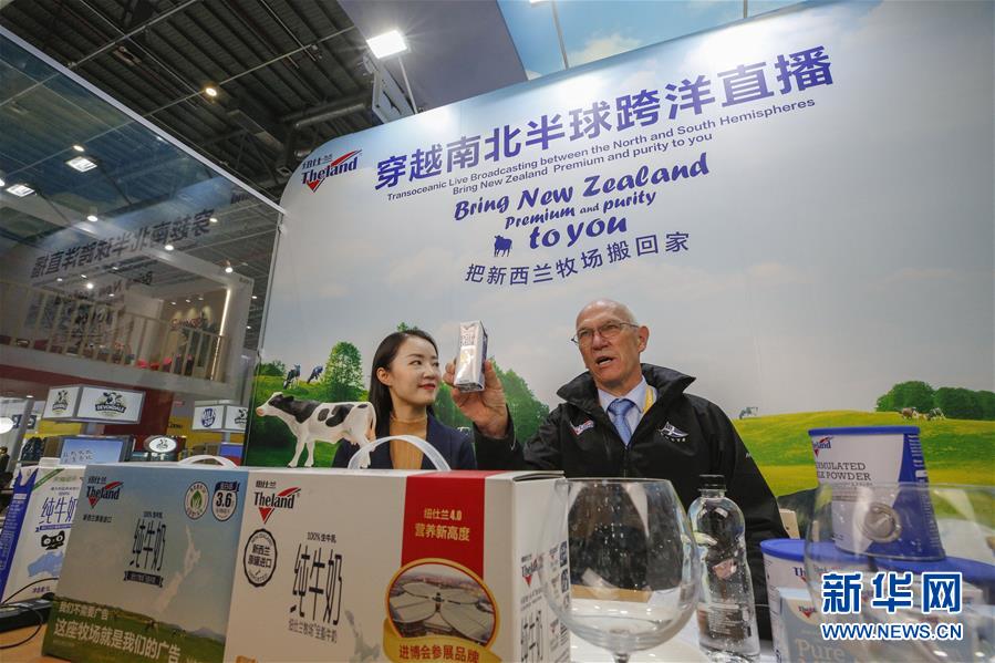 11月7日,罗伊(右)在第三届进博会纽仕兰乳业展台直播带货。新华社记者 张玉薇 摄